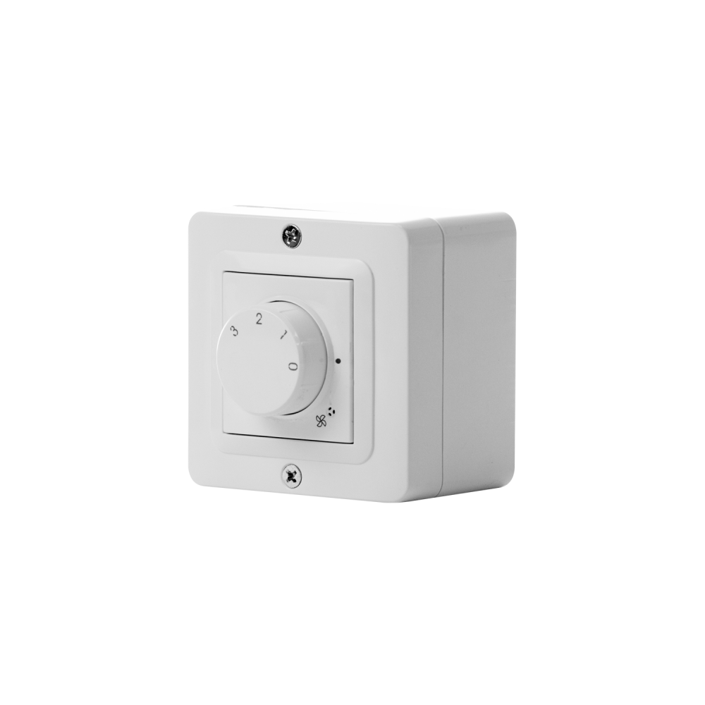 Speed selector with front selection knob, including OFF position. 230V~ 50-60 Hz. Max load 3A. Surface mounted.