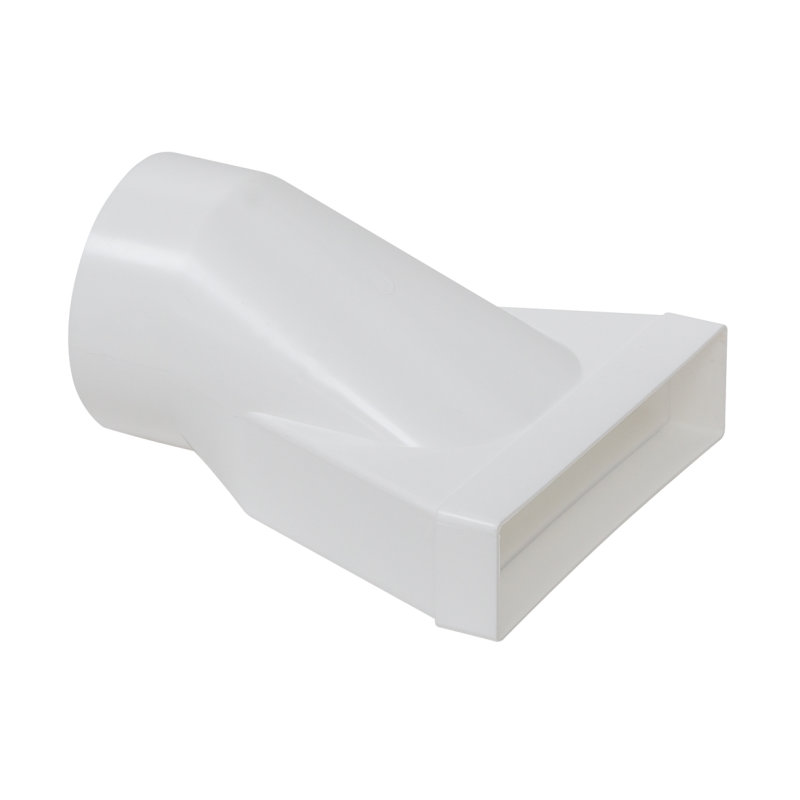 FUE 125 Flat duct transition piece from DN 125 to square, white plastic, with sleeve. Part of the F duct system. Made from polymer.
