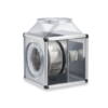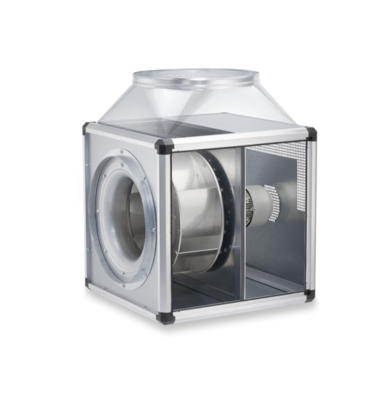 Cubical exhaust unit with supply and extract low-loss duct adapters including flexible sleeves (suitable for temperatures up to 120°C) to reduce vibration transmission. Variable applicable side panels to suit to structural conditions. Motor located outside of the air flow, therefore applicable for extraction of dirty, hot air up to max. 120°C. Supplied with condensate collector and enclosed condensation discharge as standard. Application area: Commercial kitchens and application in ventilation systems of process technology. Simple positioning by standard crane hooks.