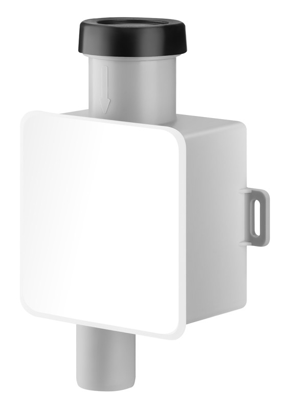 Ball siphon for KWL Yoga, wall and flush-mounted condensate siphon made of polypropylene (PP)and ABS with60 mm water seal height and ball odour barrier, in accordance with ÖNORM EN 681, DIN 19541,removablesiphon cassette, including plug-in seal(rubber) for DN 20- 32 mm. Vertical outlet connection DN32.Building protection that can be cut to the installation depth. The built-in floating valve closes the siphon in the event of a lack of water.