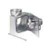 Double-walled housing made of galvanized sheet steel, soundproofed by lining with 30 mm thick mineral wool insulation panels. Suction and pressure side pipe connection pieces with rubber lip seals matched to the standard diameter. Fan door can be swung out fully for inspection and cleaning. Incl. stable mounting rails with four vibration dampers. Standard with condensate drain and drip protection when the door is open.